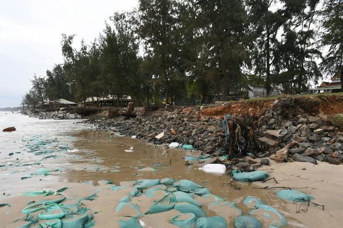 Tại nhiều vị trí, đất đá bị kéo tuột ra biển. Địa hình bờ biển vốn thoai thoải nay trở nên nham nhở, tiềm ẩn nguy cơ tiếp tục sạt lở nếu triều cường và sóng lớn còn kéo dài.