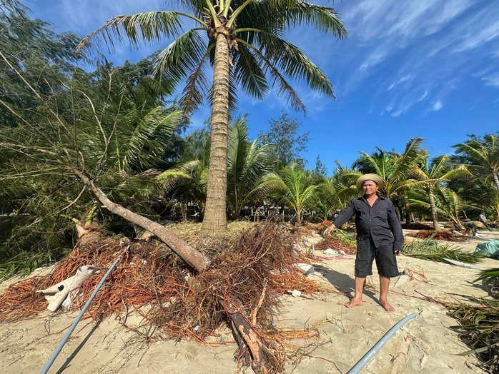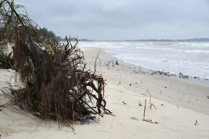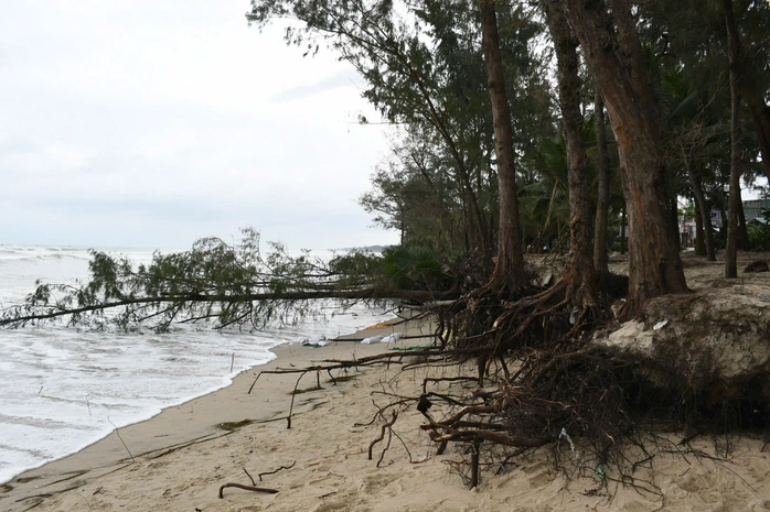 Không chỉ bờ cát bị xâm thực, rừng dương và hàng dừa ven biển – “lá chắn” tự nhiên chống sóng, gió – cũng bị đánh bật gốc, trơ rễ. Nhiều cây ngã đổ nằm chỏng chơ dọc bờ biển.