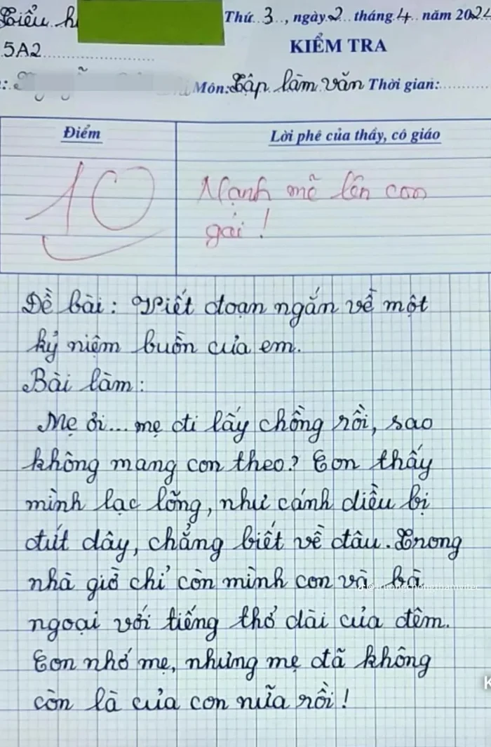 Bên dưới phần bài làm, em học sinh này trình bày như sau: “Mẹ ơi… mẹ đi lấy chồng rồi, sao không mang con theo? Con thấy mình lạc lõng, như cánh diều bị đứt dây, chẳng biết về đâu. Trong nhà giờ chỉ còn mình con và bà ngoại với tiếng thở dài của đêm. Con nhớ mẹ, nhưng mẹ đã không còn là của con nữa rồi!”.