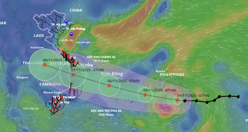 Từ ngày 5 đến 6-11, khu vực giữa Biển Đông (bao gồm vùng biển phía Bắc đặc khu Trường Sa), vùng biển ngoài khơi khu vực Đà Nẵng – Khánh Hòa có khả năng chịu tác động của gió mạnh cấp 12-14, giật trên cấp 17, sóng biển cao 8,0-10,0m. Biển động dữ dội.
