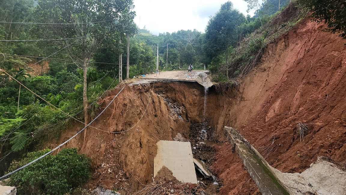 Tuyến đường ĐH83, xã Sơn Tây Hạ bị đứt gãy hoàn toàn gây chia cắt hàng nghìn hộ dân, chưa thể khắc phục. Ảnh: Viên Nguyễn