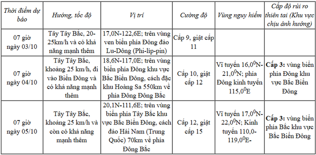 Từ chiều 3/10, vùng biển phía Đông khu vực Bắc Biển Đông có gió mạnh dần lên cấp 6-7; sau tăng lên cấp 8, vùng gần tâm bão đi qua mạnh cấp 9-10, giật cấp 12, sóng biển cao 4-6m. Biển động rất mạnh.
