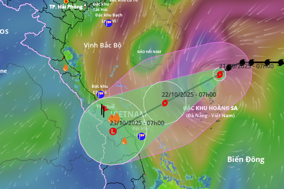 Cụ thể, lúc 10h ngày 21/10, tâm bão ở vị trí khoảng 17,8 độ vĩ Bắc – 112,4 độ kinh Đông, cách quần đảo Hoàng Sa khoảng 125km về phía Bắc. Sức gió mạnh nhất vùng gần tâm bão đạt cấp 9–10 (75–102 km/h), giật cấp 12. Bão đang di chuyển theo hướng Tây Nam với tốc độ 10–15 km/h.