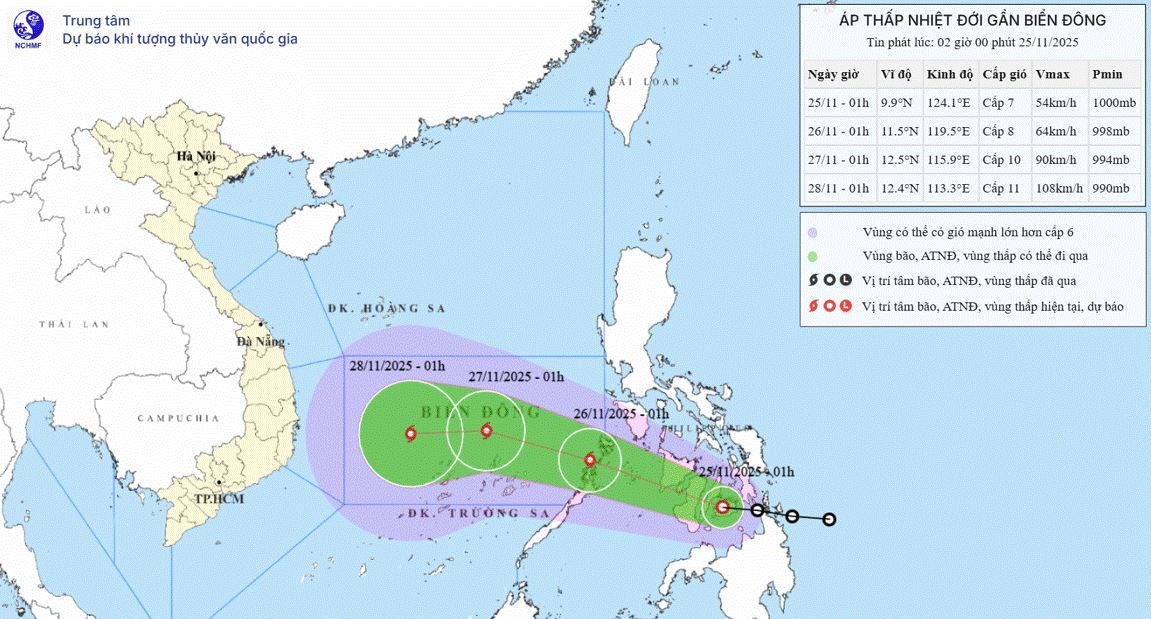 Theo Trung tâm Dự báo Khí tượng Thủy văn Quốc gia, hồi 7h ngày 25/11, vị trí tâm áp thấp nhiệt đới ở vào khoảng 10,3 độ Vĩ Bắc; 123,1 độ Kinh Đông, trên khu vực miền Trung Phi-líp-pin. Sức gió mạnh nhất vùng gần tâm áp thấp nhiệt đới mạnh cấp 7 (50-61km/giờ), giật cấp 9. Di chuyển theo hướng Tây Tây Bắc với tốc độ 20-25km/h.