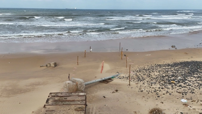 Bão Kalmaegi gây sạt lở bờ biển xã Vạn Tường khiến đoạn cáp ngầm 22 kV cấp điện cho huyện đảo Lý Sơn trồi lên mặt đất 60 m, tiềm ẩn nguy hiểm.