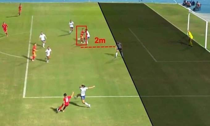 Tình huống Bích Thùy vẫn cách đường việt vị khoảng 2 m, nhưng vẫn bị từ chối bàn thắng trong trận Việt Nam thua Philippines trên loạt đá luân lưu chung kết SEA Games 33 trên sân Chonburi, Thái Lan tối 17/12/2025. Ảnh: chụp màn hình