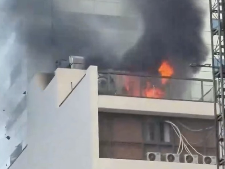 Khói lửa bùng lên từ sân thượng của spa 7 tầng trên đường Lê Thánh Tôn, phường Sài Gòn, cảnh sát triển khai xe thang cao hơn 20 m hỗ trợ người mắc kẹt, sáng 9/1.