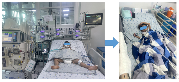 Các bác sĩ tại BV địa phương đã cho bệnh nhi thở máy, dịch truyền, vận mạch: adrenaline 0.1 mcg/kg/ph, solumedrol, dimedrol, kháng sinh… Tiến hành hội chẩn qua on-call camera, các bác sĩ BV Nhi đồng thành phố đã hướng dẫn các bác sĩ tại BV địa phương thực hiện kỹ thuật lọc máu liên tục và kỹ thuật thay huyết tương cho bệnh nhi. Tuy nhiên, tình trạng bệnh nhi không cải thiện, diễn tiến phức tạp nên được chuyển Bệnh viện Nhi đồng thành phố điều trị tiếp.