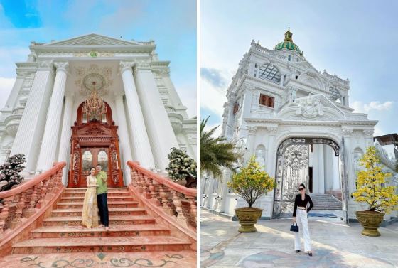 Vợ chồng Ngân Collgen chụp ảnh tại căn nhà 500 tỷ đồng. Ảnh: Trần Thị Bích Ngân/Facebook.