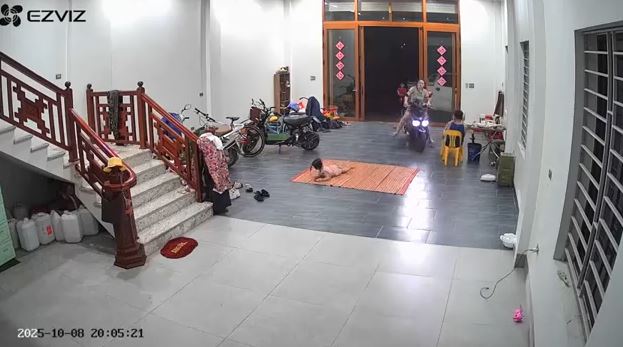 Theo diễn biến từ camera, người vợ đang lái xe máy từ ngoài sân vào trong nhà qua cửa chính. Trong nhà lúc này, người chồng đang ngồi chơi trên ghế nhựa, một em bé cũng đang nằm chơi trên chiếc chiếu gần đó.