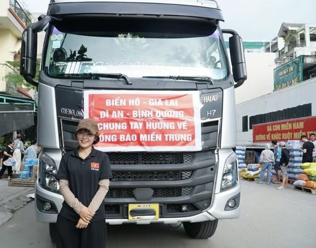 Chiều 23/11, tại điểm tập kết hàng cứu trợ ở Dĩ An (tỉnh Bình Dương cũ, nay thuộc TP HCM), giữa hàng trăm tình nguyện viên đang tất bật phân loại nhu yếu phẩm, chiếc xe 34 tấn của Duyên nổi bật với màu tím lạ mắt và hình rồng uốn lượn trên nắp ca pô. Từ Gia Lai xuống TP HCM để gom hàng, cô dự định chạy thẳng ra miền Trung trao tận tay người dân đang oằn mình chống lũ.