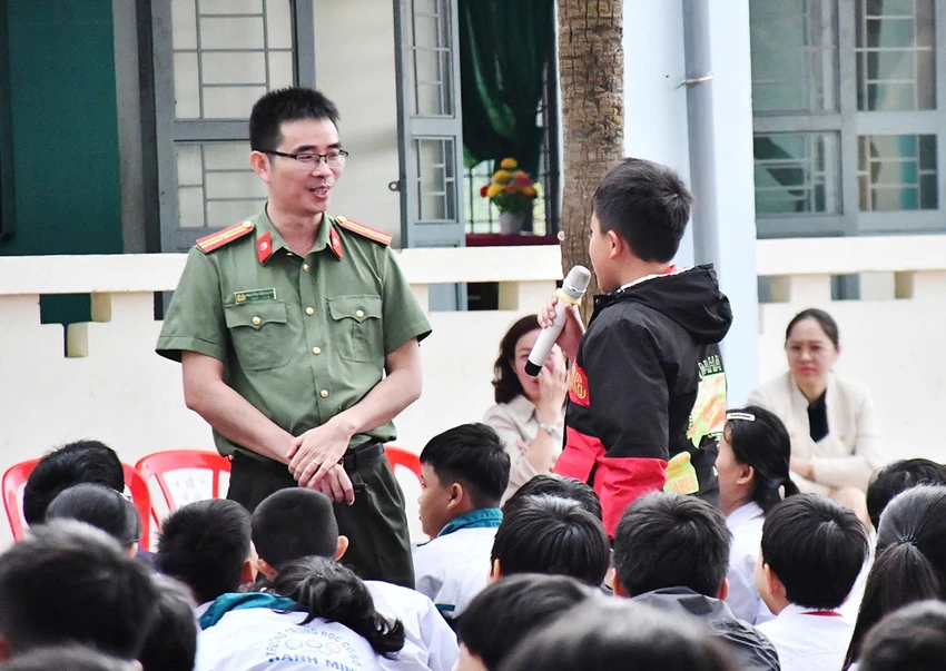 Thiếu tá Nguyễn Tiến Quân trong một buổi tuyên truyền, phổ biến pháp luật, nâng cao cảnh giác về các thủ đoạn lừa đảo trực tuyến cho học sinh trên địa bàn tỉnh Quảng Ngãi.