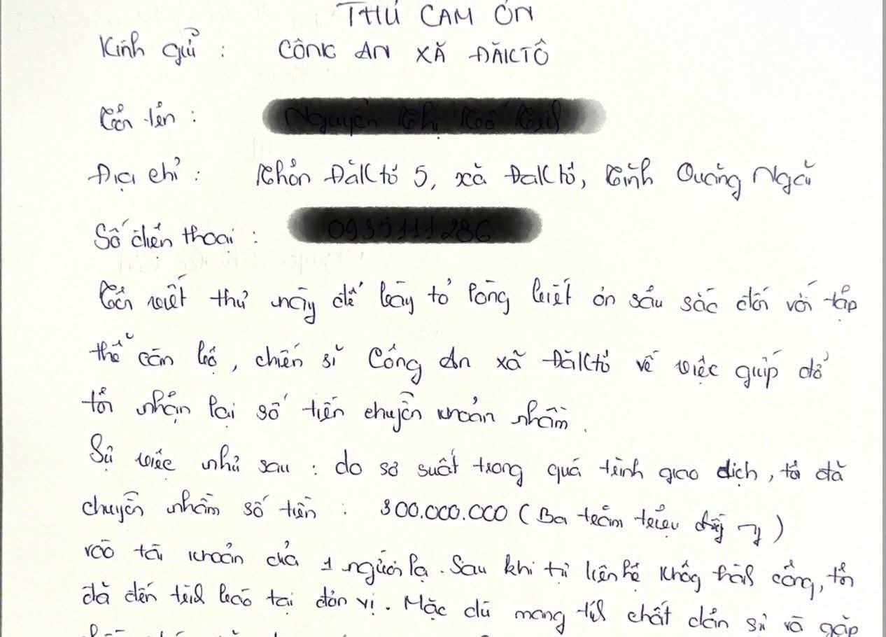 Ngày 27/12, Công an xã Đăk Tô, tỉnh Quảng Ngãi cho biết vừa hỗ trợ, giúp người dân lấy lại 300 triệu đồng sau khi chuyển nhầm vào tài khoản của người khác.