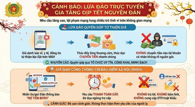 Ngày 6.1, Công an tỉnh Quảng Ngãi phát cảnh báo các chiêu trò lừa đảo trực tuyến gia tăng dịp cận Tết Nguyên đán. Theo Công an tỉnh Quảng Ngãi, khi nhu cầu mua sắm, chuyển tiền và thực hiện các thủ tục hành chính của người dân tăng cao, các đối tượng tội phạm công nghệ cao cũng lợi dụng tung ra hàng loạt chiêu trò lừa đảo tinh vi trên không gian mạng.
