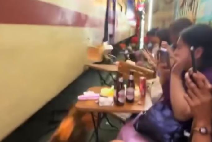 Đoạn video dài hơn 10 giây, cho thấy hàng quán kê bàn ghế sát mép ray. Khi tàu đi qua, một số bàn bị hất văng. Du khách ngồi gần bật dậy, la hét, trong khi nhiều người cầm điện thoại ghi hình. Video nhanh chóng thu hút hơn 2 triệu lượt xem chỉ sau một ngày đăng tải.