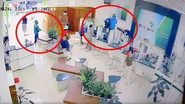 Hình ảnh các đối tượng cướp tiền tại phòng giao dịch ngân hàng.