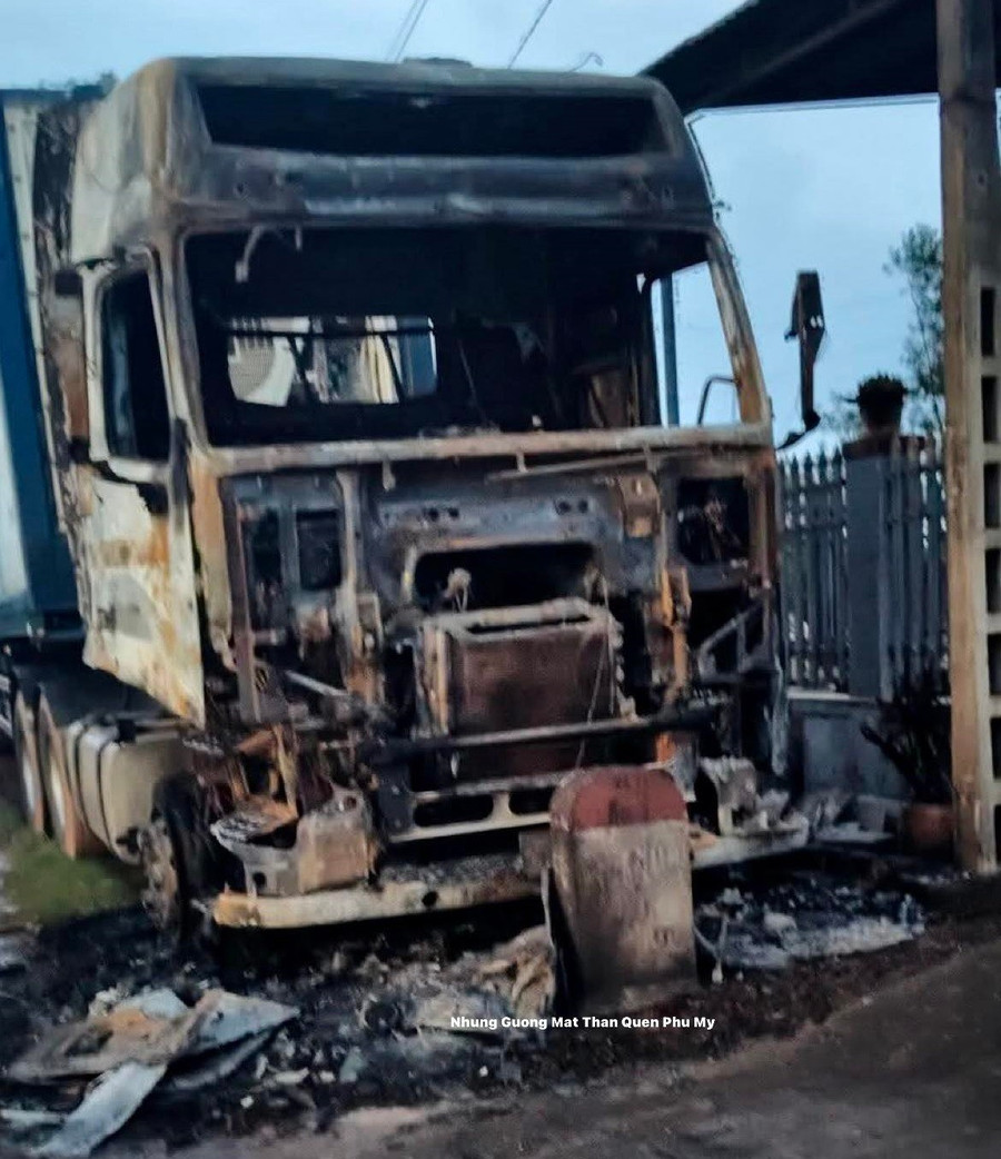 Xe đầu kéo bị thiêu rụi phần đầu. Ảnh người dân cung cấp