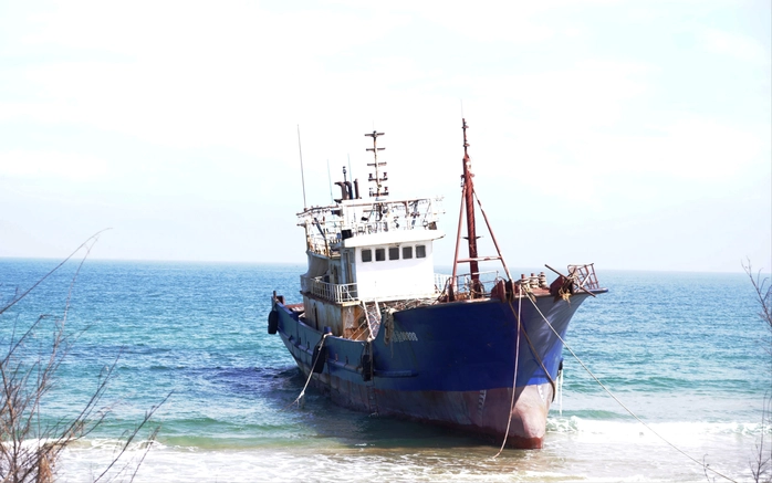 Tàu sắt có chữ Trung Quốc bị mắc cạn khá gần bờ ở vùng biển Dung Quất
