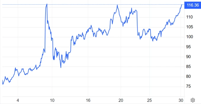 Chiến sự tại Trung Đông đã kéo dài hơn một tháng, lan rộng toàn khu vực, khiến giá năng lượng tăng cao và thổi bùng nỗi lo lạm phát. Từ khi xung đột diễn ra, giá Brent và WTI đã tăng khoảng 50%. Xung đột khiến nguồn cung dầu toàn cầu giảm 11 triệu thùng mỗi ngày, khi eo biển Hormuz bị Iran kiểm soát.