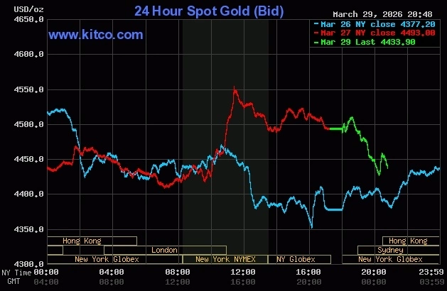 Giá vàng thế giới cũng quay đầu giảm sau phiên tăng cuối tuần trước. Hiện mỗi ounce mất 60 USD về 4.433 USD.