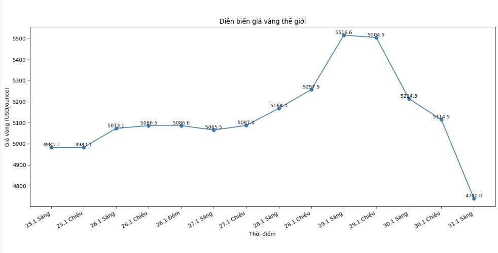 Đêm qua, giá vàng thế giới giao ngay liên tục rơi khỏi các ngưỡng tâm lý quan trọng 5.000, 4.900 rồi 4.800 USD/ounce, trong khi bạc cũng mất mốc 100 rồi 90 USD/ounce. Tính đến 1h20 ngày 31.1 (giờ Việt Nam), giá vàng giao ngay niêm yết ở ngưỡng 4.740 USD/ounce, trong khi bạc giao ngay về mốc 76,15 USD/ounce.