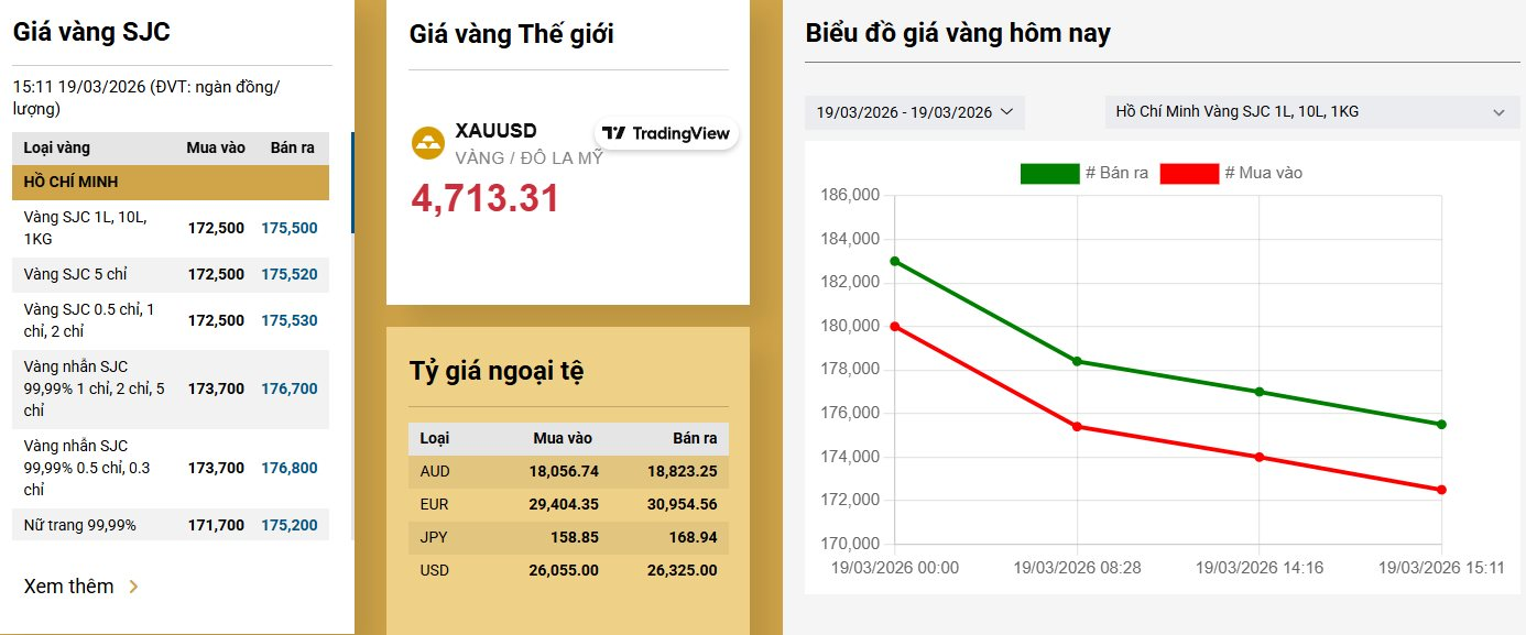 Giá vàng 999.0 phi SJC có giá mua vào là 164 triệu đồng/lượng vào chiều nay 19/3.