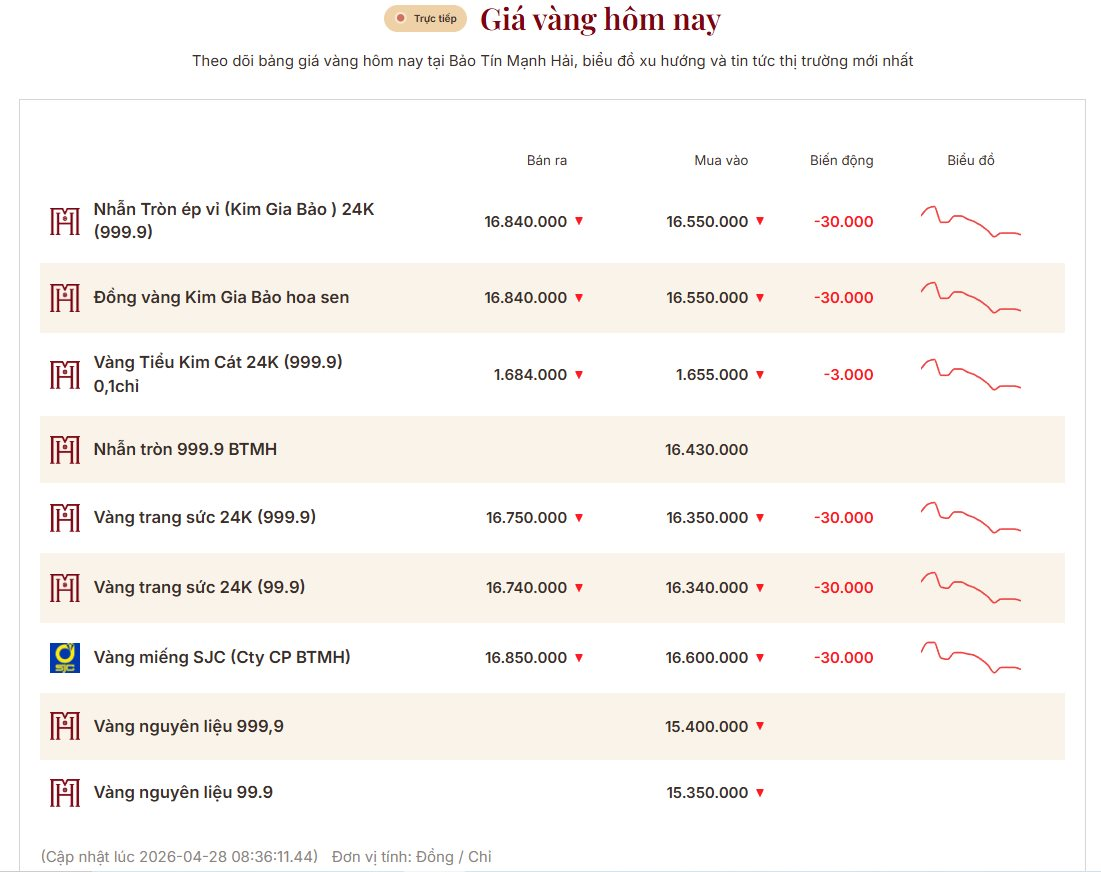 Ghi nhận trong phiên giao dịch sáng ngày 28/4/2026, giá vàng trong nước tiếp tục xu hướng đi xuống, phản ánh sự thận trọng của thị trường trước các biến động địa chính trị toàn cầu.