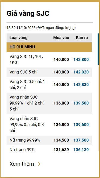 Cụ thể, tại thời điểm 9 giờ sáng 12/10, Công ty Vàng bạc đá quý Sài Gòn (SJC) niêm yết giá vàng miếng SJC mua vào-bán ra ở mức 140,8-142,8 triệu đồng/lượng. Chênh lệch mua-bán 2 triệu đồng/lượng.