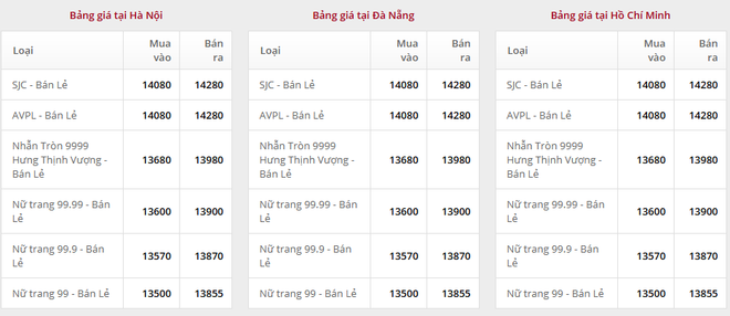 Thương hiệu này niêm yết giá vàng nhẫn Doji Hưng Thịnh Vượng 9999 mua vào-bán ra ở mức 136,8-139,8 triệu đồng/lượng. Chênh lệch mua-bán lên tới 3 triệu đồng/lượng.