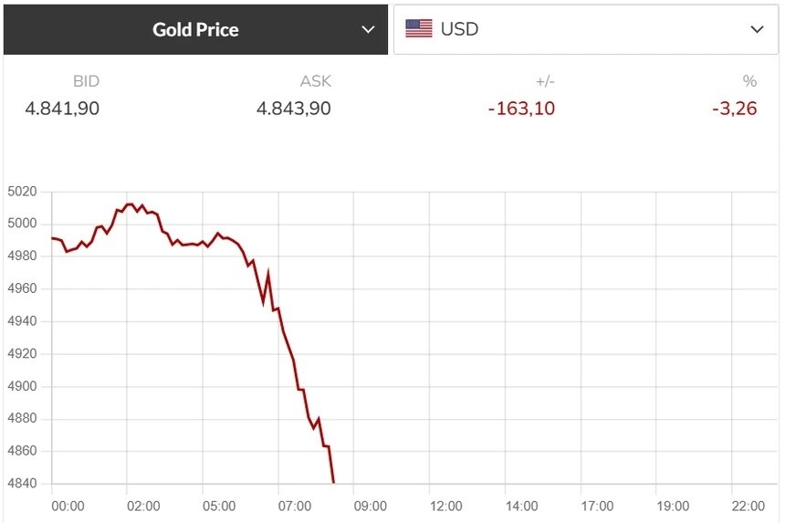 Giá vàng thế giới tiếp tục lao dốc, mất mốc quan trọng 5.000 USD/ounce và hiện giao dịch quanh 4.841 USD/ounce. Áp lực bán kéo dài từ các phiên trước kết hợp với dữ liệu lạm phát nóng tại Mỹ làm gia tăng kỳ vọng Fed duy trì lãi suất cao.