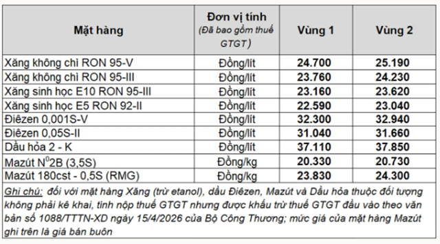 Ở thị trường trong nước, giá bán lẻ xăng dầu được liên Bộ Công Thương – Tài chính điều chỉnh từ 0h ngày 16/4/2026 và hiện giữ ổn định.