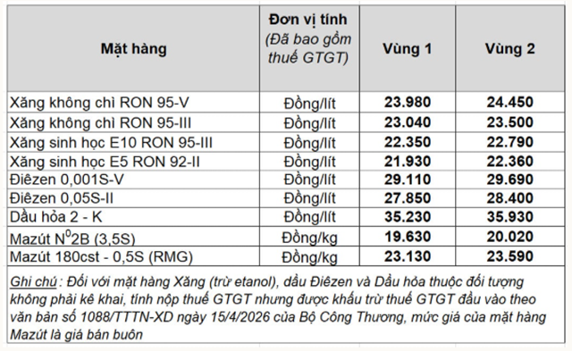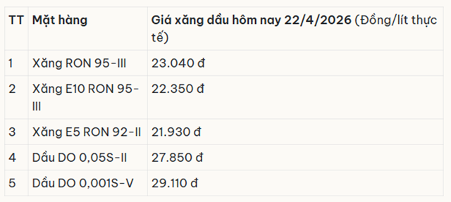 Tại Việt Nam, giá bán lẻ xăng dầu ngày 23/4 được giữ theo mức điều chỉnh từ kỳ điều hành ngày 21/4, cụ thể:
