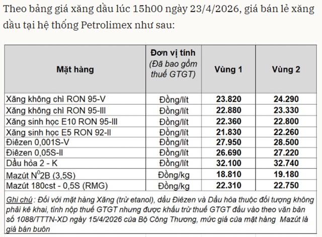 Bảng giá xăng dầu hôm nay 24/4/2026 tại Petrolimex