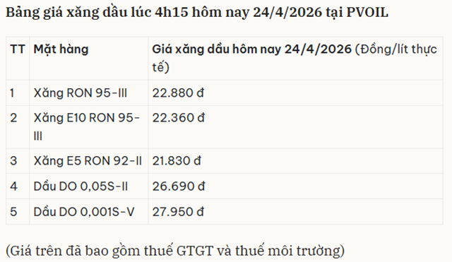 Bảng giá xăng dầu hôm nay 24/4/2026 tại PVOIL