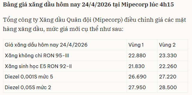 Bảng giá xăng dầu hôm nay 24/4/2026 tại Mipecorp