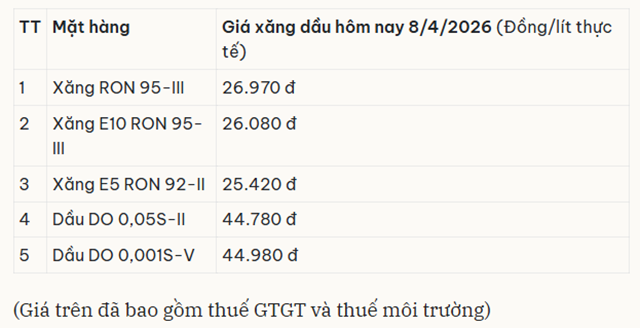 Giá xăng dầu hôm nay 8/4/2026 lúc 4h15 sáng. Bảng giá xăng dầu hôm nay 8/4/2026 từ Petrolimex, PVOIL, Mipecorp, Thalexim… Các loại xăng RON 95, RON 92, dầu Diesel… trong nước có giá như thế nào?