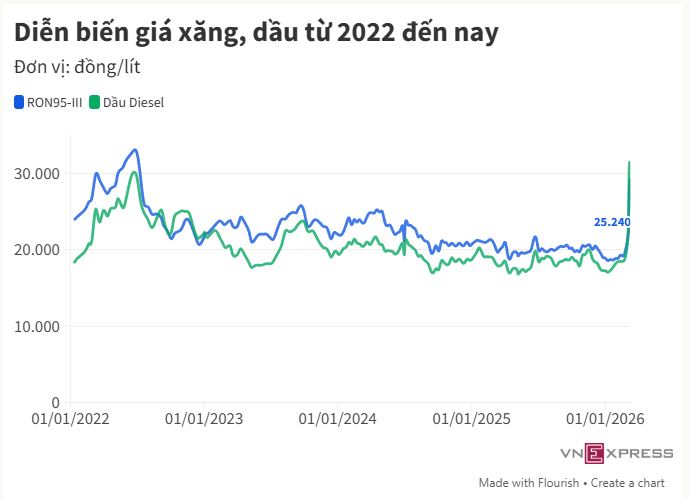 Từ 22h hôm nay, giá xăng RON95-III giảm xuống 25.240 đồng, dầu diesel hạ 4.240 đồng ở mức 26.470 đồng một lít.