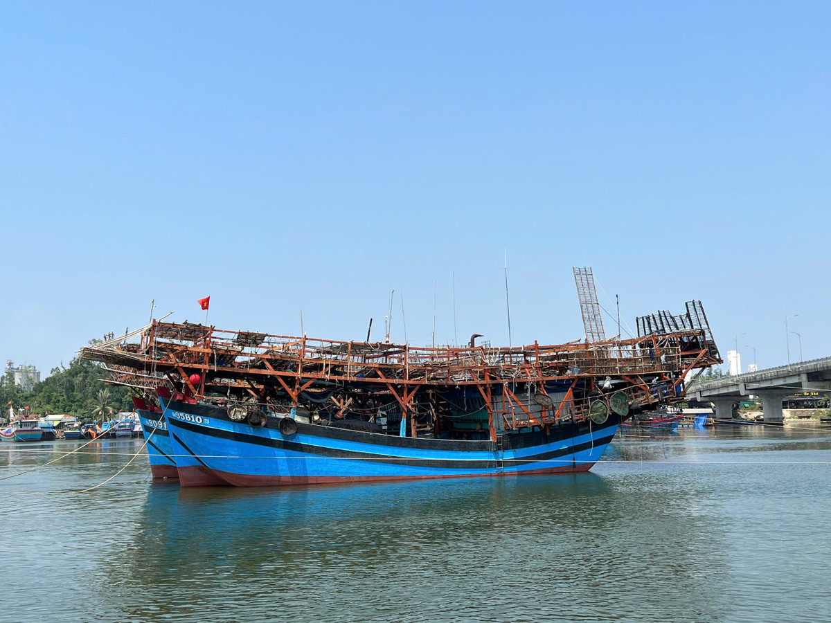 Tàu câu mực của ngư dân Quảng Ngãi neo đậu trên sông Trà Bồng.