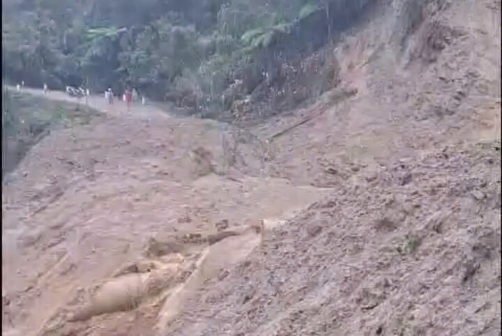 Hàng nghìn mét khối đất đá từ sườn núi đổ ập xuống đường sau tiếng nổ lớn ở xã Ngọc Linh, tỉnh Quảng Ngãi.