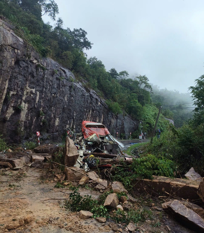 Một phần đầu ôtô vị trí cabin bị đất đá đổ xuống làm tách rời. Phía bên phải của thân xe cũng bị nhiều khối đá rơi từ trên cao làm biến dạng, vỡ kính cửa sổ, khung sắt, giường nằm méo mó. Nhiều người mắc kẹt bên trong xe.