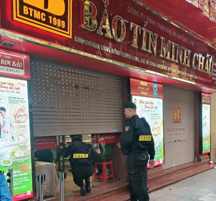 Lực lượng chức năng xuất hiện tại các cửa hàng của Công ty TNHH Bảo Tín Minh Châu ở Hà Nội.