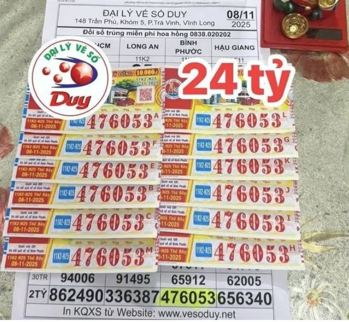Anh Lưu Quốc Duy, chủ đại lý vé số Duy (phường Trà Vinh, Vĩnh Long), đã xác nhận với Thanh Niên Online thông tin “gây sốt” này. Anh cho biết vừa hoàn tất đổi thưởng 13 tờ vé số trúng độc đắc của xổ số miền Nam ngày 8 tháng 11. Cụ thể, đây là dãy số 476053 của đài Bình Phước.