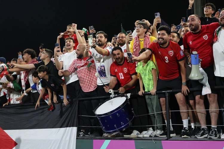 Cầu thủ và người hâm mộ Jordan mừng vé vào tứ kết, sau khi thắng Kyrgyzstan 1-0 và Việt Nam hạ Arab Saudi 1-0 ở lượt cuối bảng A U23 châu Á 2026, ngày 12/1/2026. Ảnh: AFC