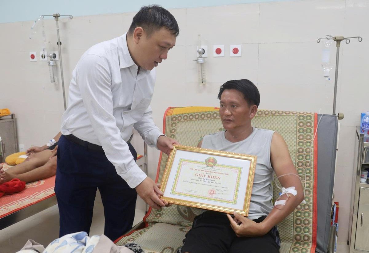 Chủ tịch UBND đặc khu Lý Sơn trao giấy khen cho anh Phan Duy Quang