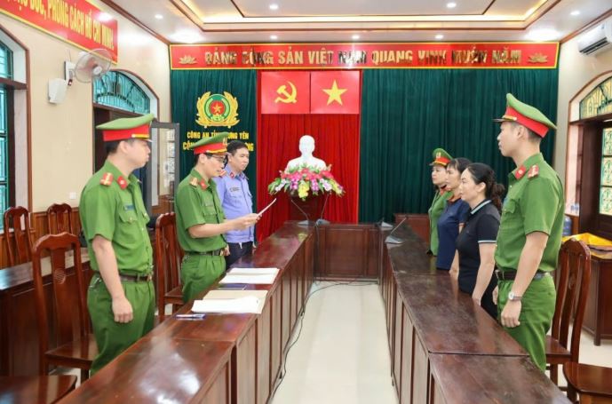 Cơ quan Cảnh sát điều tra đọc quyết định khởi tố bị can đối với Nguyễn Thị Lan, Nguyễn Thị Phương (Ảnh: Công an Hưng Yên).