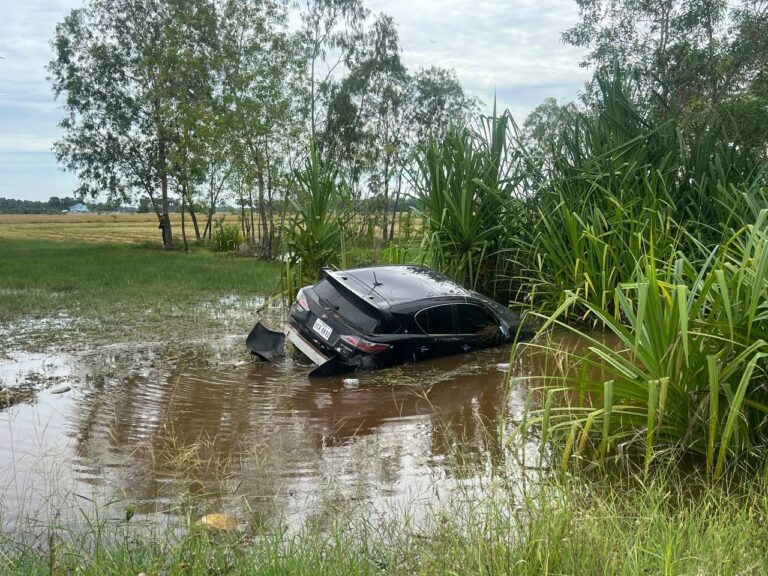 Một trong hai chiếc xe của những kẻ trốn chạy lao xuống ao ở ngoại ô thành phố Svay Rieng, Campuchia. Ảnh: Khmer Times