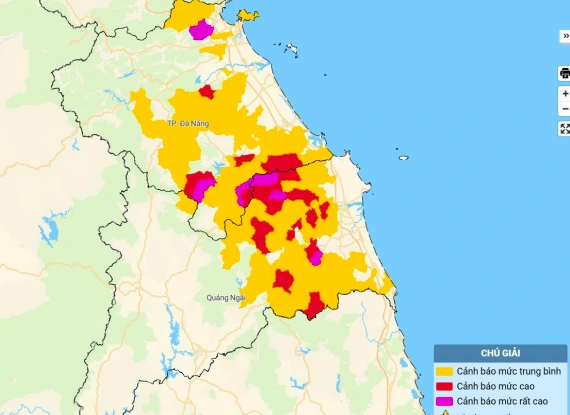 Bản đồ cảnh báo nhiều xã, phường ở Đà Nẵng, Quảng Ngãi có nguy cơ xảy ra lũ quét, sạt lở đất sau mưa lớn. ẢNH: NCHMF