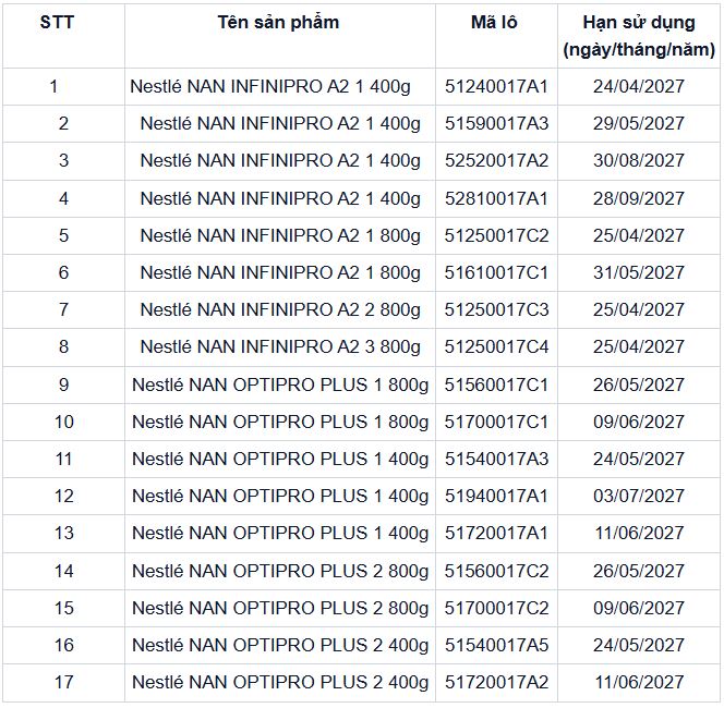 Đợt thu hồi lần này chỉ áp dụng đối với 17 lô sữa NAN do chính Nestlé Việt Nam nhập khẩu trực tiếp, có mã số lô và hạn sử dụng cụ thể đã được công bố. Đáng chú ý, thị trường Việt Nam vốn tồn tại nhiều nguồn cung ứng sữa NAN khác nhau từ hàng xách tay đến các đơn vị nhập khẩu khác, do đó người tiêu dùng cần kiểm tra kỹ mã lô trên bao bì.