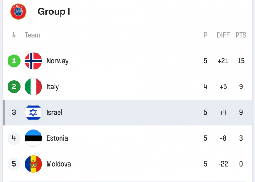 Israel đang xếp thứ 3 bảng I – Vòng loại World Cup 2026 khu vực châu Âu