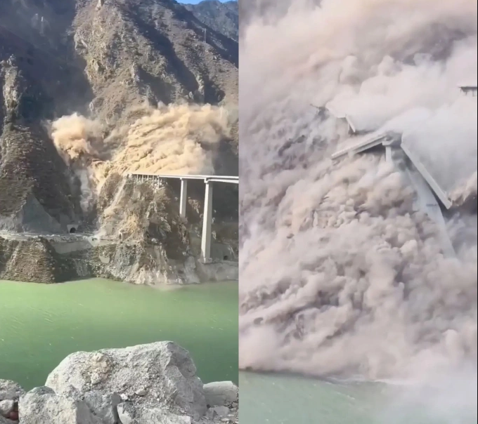 Đoạn video lan truyền trên mạng hôm 11/11 cho thấy khối đất đá khổng lồ từ sườn núi đổ ập xuống, nghiền nát phần mặt cầu, khiến một nhịp rơi thẳng xuống dòng sông bên dưới. Bụi và mảnh vỡ phủ kín khu vực miền núi hẻo lánh ở tây nam Trung Quốc.